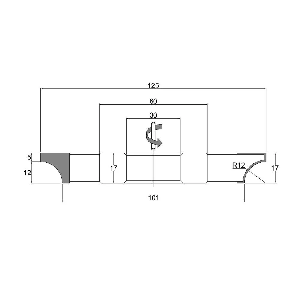 12 mm rádiusz profilú, 125 mm átmérőjű, 17 mm vastag, 3 késes, R jobbos, HM, forrasztott lapkás konkáv negyedkörmaró, Woodmaster ipari minőségű, faipari asztali marófej Tigra Germany vídia késekkel.