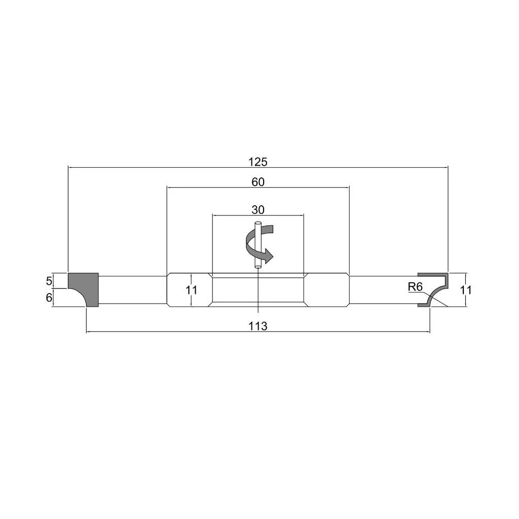 6 mm rádiusz profilú, 125 mm átmérőjű, 11 mm vastag, 3 késes, R jobbos, HM, forrasztott lapkás konkáv negyedkörmaró, Woodmaster ipari minőségű, faipari asztali marófej Tigra Germany vídia késekkel.