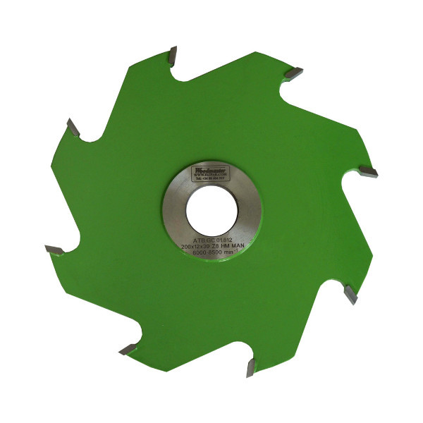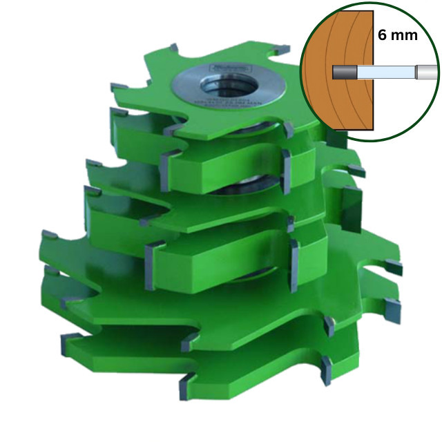 125 mm átmérőjű, 6 mm vastag, 6 késes, HM, forrasztott lapkás nútmaró, tárcsás maró, Woodmaster ipari minőségű, faipari asztali marófej Tigra Germany vídia késekkel.