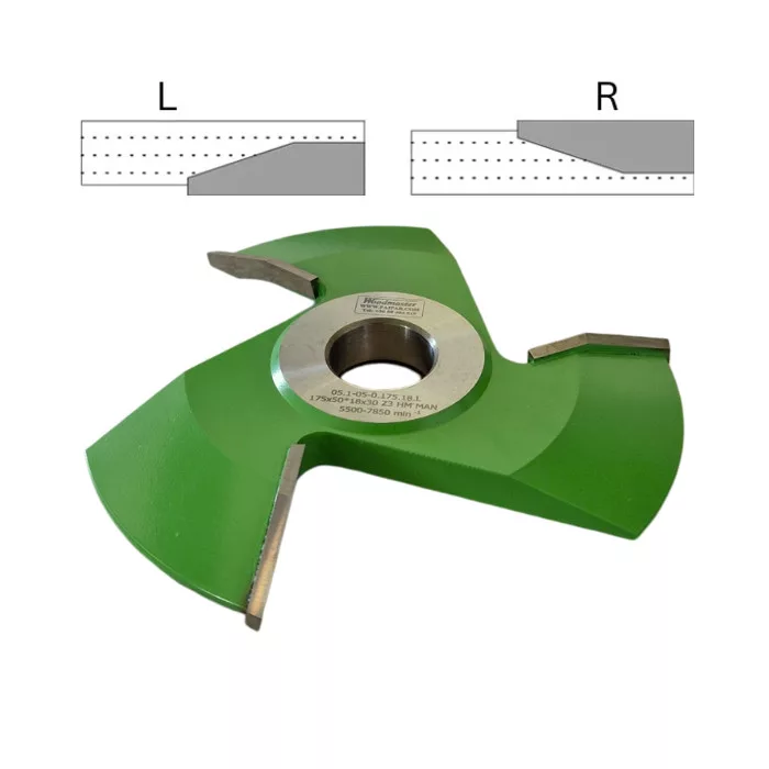 175 mm átmérőjű, 15 mm vastag, maximum 63 mm mélységű, 3 késes, L balos, HM, forrasztott lapkás plattoló maró, Woodmaster ipari minőségű, faipari asztali marófej Tigra Germany vídia késekkel.